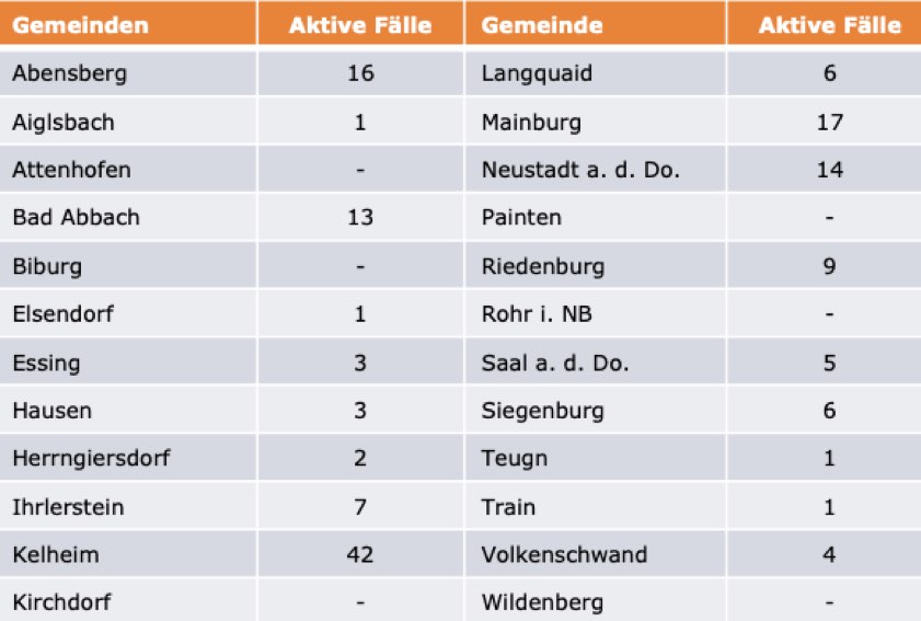 (ty) Im Kreis Kelheim gibt es in Zusammenhang mit der Corona-Pandemie, wie berichtet, mittlerweile 39 Menschenleben zu beklagen. Unter Verweis auf Daten des Gesundheitsamts teilte das Landratsamt heute mit, dass – Stand gestern, 16 Uhr – die Zahl der im Kreis Kelheim positiv auf den neuartigen Erreger getesteten Menschen bei insgesamt 1800 liegt – das sind 16 mehr als gestern gemeldet. 1610 hiesige Corona-Patienten (gestern: 1587) gelten mittlerweile als genesen und sind aus der Quarantäne entlassen. Derzeit gibt es 151 aktive Corona-Fälle im Landkreis (gestern: 158). Zahlen aus den einzelnen Gemeinden zeigt die Tabelle unten.