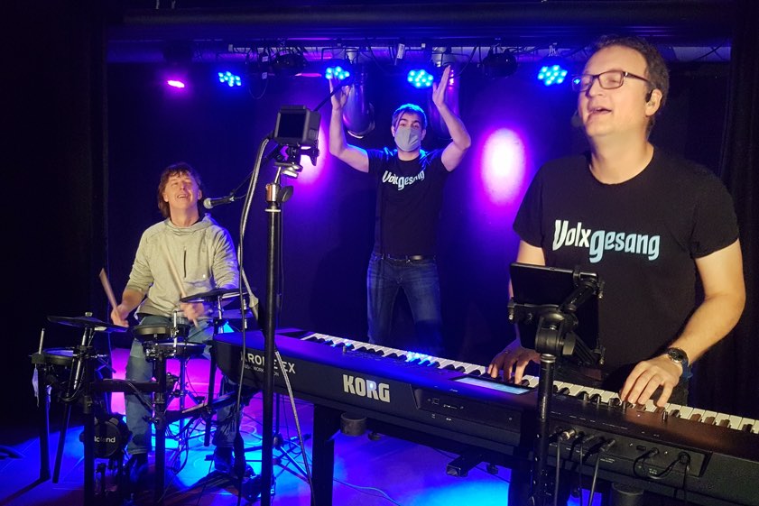 "Es ist ein Kulturformat, das derzeit allerorts aus der Not geboren wird und dennoch zukunftsfähig scheint", meint die "Frau hinter den Kulissen" beim "VolxGesang"-Spektakel. "Auch für die Nach-Corona-Zeit", ergänzt Pianist und Vorsänger Michael Herrmann, der beim ersten Sendetermin von seinem "VolxGesang"-Pendant Julian Oswald unterstützt worden war – für den richtigen Beat hatte Rolf Berger an den Drums gesorgt. Seine seit Monaten verwaiste Bühne hat Herrmann in den vergangenen Wochen umgebaut und um professionelles Live-Streaming-Equipment erweitert.