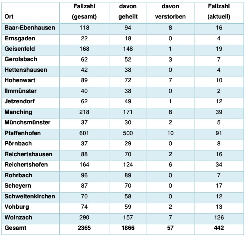 Jeweils wie viele Menschen aus welcher der insgesamt 19 Gemeinden im Landkreis Pfaffenhofen bislang positiv auf das Corona-Virus getestet worden sind, können Sie der tabellarischen Aufstellung in diesem Beitrag entnehmen, die auch heute wieder vom Pfaffenhofener Landratsamt herausgegeben worden ist. "Aufgrund der mittlerweile erhöhten Zahl der Infektionen ist ein unmittelbarer Zusammenhang zu einzelnen infizierten Personen nicht mehr herstellbar", hatte die Behörde dazu erklärt. "Die Persönlichkeitsrechte der Betroffenen sind daher weiterhin geschützt."