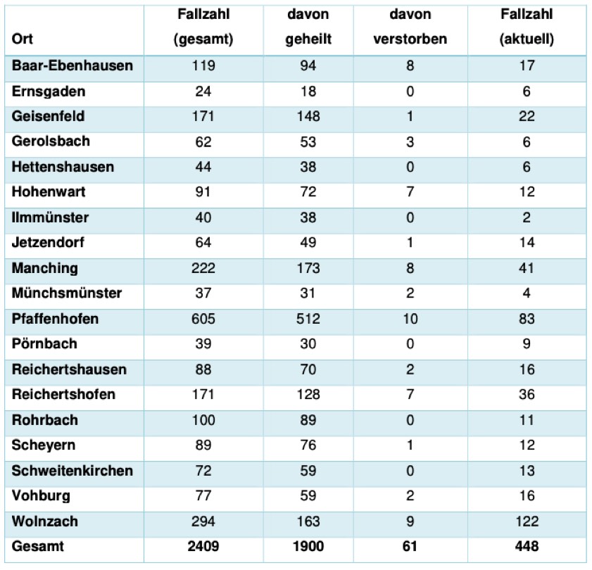 Jeweils wie viele Menschen aus welcher der insgesamt 19 Gemeinden im Landkreis Pfaffenhofen bislang positiv auf das Corona-Virus getestet worden sind, können Sie der tabellarischen Aufstellung in diesem Beitrag entnehmen, die auch heute wieder vom Pfaffenhofener Landratsamt herausgegeben worden ist. "Aufgrund der mittlerweile erhöhten Zahl der Infektionen ist ein unmittelbarer Zusammenhang zu einzelnen infizierten Personen nicht mehr herstellbar", hatte die Behörde dazu erklärt. "Die Persönlichkeitsrechte der Betroffenen sind daher weiterhin geschützt."