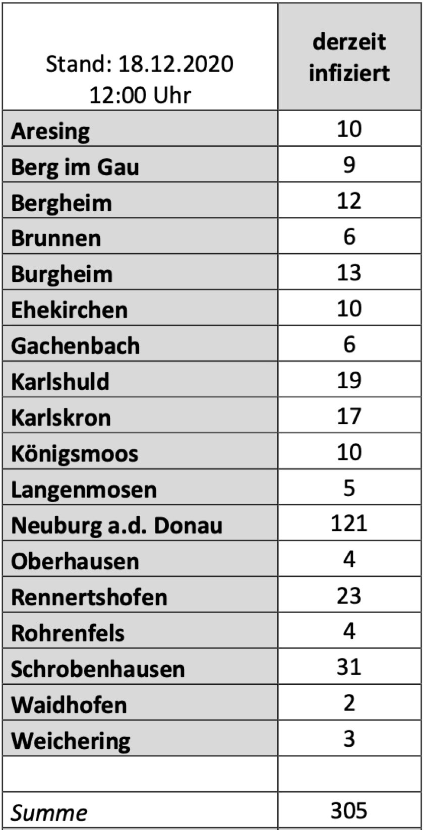 (ty) Im Kreis Neuburg-Schrobenhausen gibt es in Zusammenhang mit der Corona-Pandemie, wie berichtet, mittlerweile 42 Menschenleben zu beklagen. Die weitere Situation in dem Kreis stellt sich nach Angaben des Landratsamts wie folgt dar: Bislang – Stand: heute, 12 Uhr – wurden 1915 Landkreis-Bürger positiv auf den neuartigen Erreger getestet. Die Zahl hat sich seit der gestrigen Meldung um 30 erhöht. Von den Infizierten gelten mittlerweile 1568 als genesen; das sind 53 mehr als gestern. Momentan gibt es in dem Landkreis 328 aktive Corona-Fälle (gestern: 300). Aktuelle Zahlen aus den Gemeinden zeigt die Tabelle unten. Mittlerweile gilt ein bayernweiter Lock-Down, der unter anderem nächtliche Ausgangssperren bedeutet.
