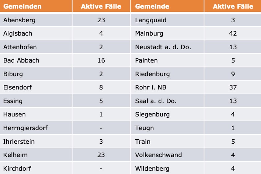(ty) Im Kreis Kelheim gibt es in Zusammenhang mit der Corona-Pandemie ein weiteres Menschenleben zu beklagen. Wie das Landratsamt heute mitteilte, erhöht sich damit die Anzahl der Landkreis-Bürger, die mit dem Virus infiziert waren und gestorben sind, auf nunmehr 40. Unter Verweis auf Daten des Gesundheitsamts teilte das Landratsamt heute mit, dass – Stand gestern, 16 Uhr – die Zahl der im Kreis Kelheim positiv auf den neuartigen Erreger getesteten Menschen bei insgesamt 2108 liegt – das sind 38 mehr als gestern gemeldet. 1841 hiesige Corona-Patienten (gestern: 1797) gelten mittlerweile als genesen und sind aus der Quarantäne entlassen. Derzeit gibt es 227 aktive Corona-Fälle im Landkreis (gestern: 234). Zahlen aus den einzelnen Gemeinden zeigt die Tabelle unten. Mittlerweile gilt ein bayernweiter Lock-Down, der unter anderem nächtliche Ausgangssperren bedeutet.