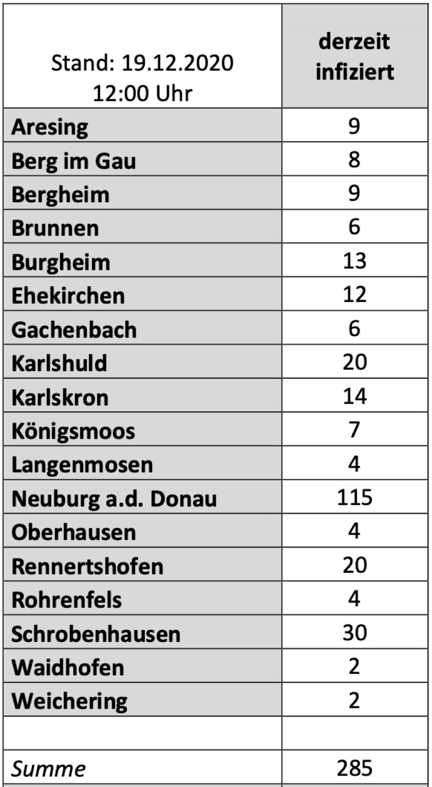 (ty) Im Kreis Neuburg-Schrobenhausen gibt es in Zusammenhang mit der Corona-Pandemie zwei weitere Menschenleben zu beklagen. Wie das Landratsamt heute mitteilte, erhöht sich damit die Zahl der Landkreis-Bürger, die mit dem Virus infiziert waren und gestorben sind, auf 44. Die weitere Situation in dem Kreis stellt sich nach Angaben des Landratsamts wie folgt dar: Bislang – Stand: heute, 12 Uhr – wurden 1938 Landkreis-Bürger positiv auf den neuartigen Erreger getestet. Die Zahl hat sich seit der gestrigen Meldung um 23 erhöht. Von den Infizierten gelten mittlerweile 1609 als genesen; das sind 41 mehr als gestern. Momentan gibt es in dem Landkreis 285 aktive Corona-Fälle (gestern: 328). Aktuelle Zahlen aus den Gemeinden zeigt die Tabelle unten. Mittlerweile gilt ein bayernweiter Lock-Down, der unter anderem nächtliche Ausgangssperren bedeutet.