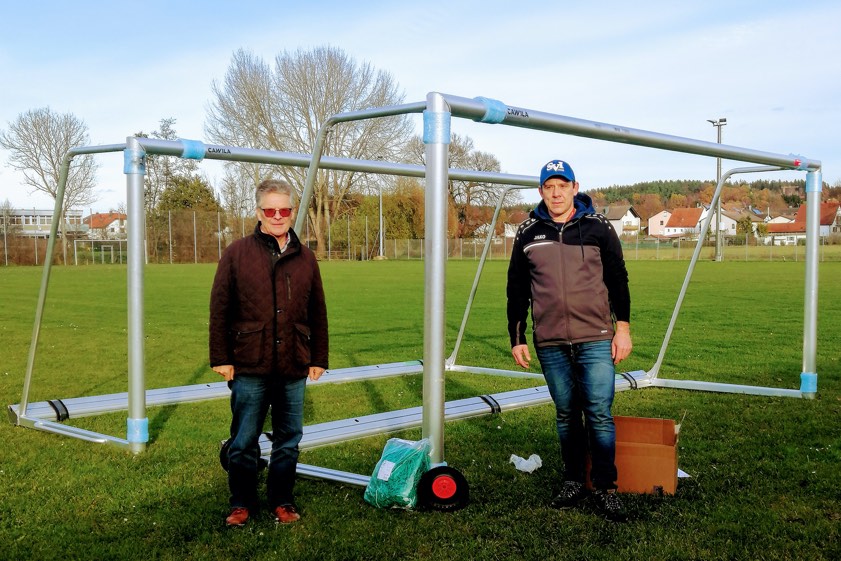 Die Jugend-Leiter konnten schließlich einen Pauschalpreis von 2350 Euro vereinbaren, der vom Förderverein voll übernommen wird. Dabei wird der Förderverein nach eigenen Angaben bei der Finanzierung großzügig von der Sparkasse und der Brauerei Müllerbräu unterstützt. Die neuen, tragbaren Tore seien jetzt schon geliefert worden, sodass die Kinder und Jugendlichen bei der hoffentlich im Frühjahr wieder beginnenden Fußball-Saison mit viel Spaß und Freude ihren Fußballsport ausüben können. Auf dem Foto oben: Florian Weiß, der Vorsitzende des Fördervereins (links), mit Jugend-Leiter Ralf Spindler.
