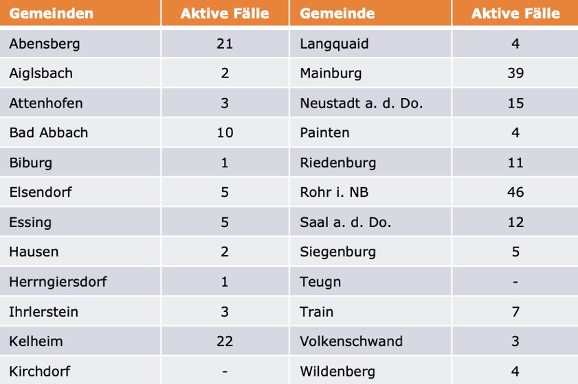 (ty) Im Kreis Kelheim gibt es in Zusammenhang mit der Corona-Pandemie ein weiteres Menschenleben zu beklagen. Wie das Landratsamt heute mitteilte, erhöht sich damit die Zahl der mit dem Virus infizierten Landkreis-Bürger, die gestorben sind, auf 41. Unter Verweis auf Daten des Gesundheitsamts teilte das Landratsamt heute mit, dass – Stand gestern, 16 Uhr – die Zahl der im Kreis Kelheim positiv auf den neuartigen Erreger getesteten Menschen bei insgesamt 2170 liegt – das sind 14 mehr als gestern gemeldet. 1904 hiesige Corona-Patienten (gestern: 1880) gelten mittlerweile als genesen und sind aus der Quarantäne entlassen. Derzeit gibt es 225 aktive Corona-Fälle im Landkreis (gestern: 236). Zahlen aus den einzelnen Gemeinden zeigt die Tabelle unten. Mittlerweile gilt ein bayernweiter Lock-Down, der unter anderem nächtliche Ausgangssperren bedeutet.