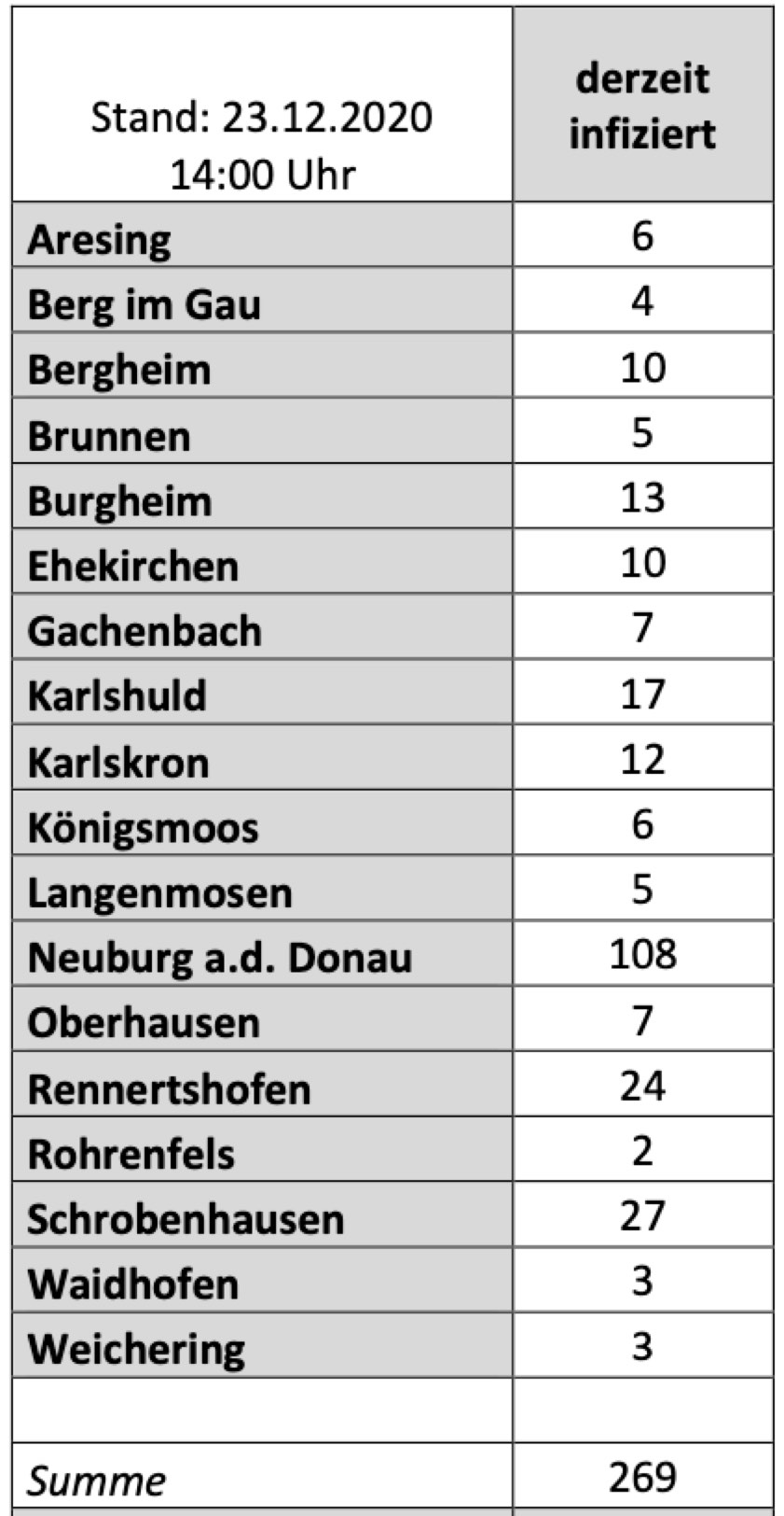 (ty) Im Kreis Neuburg-Schrobenhausen gibt es in Zusammenhang mit der Corona-Pandemie, wie berichtet, mittlerweile 44 Menschenleben zu beklagen. Die weitere Situation in dem Kreis stellt sich nach Angaben des Landratsamts wie folgt dar: Bislang – Stand: heute, 14 Uhr – wurden 2035 Landkreis-Bürger positiv auf den neuartigen Erreger getestet. Die Zahl hat sich seit der gestrigen Meldung um 30 erhöht. Von den Infizierten gelten mittlerweile 1722 als genesen; das sind 13 mehr als gestern. Momentan gibt es in dem Landkreis 269 aktive Corona-Fälle (gestern: 252). Aktuelle Zahlen aus den Gemeinden zeigt die Tabelle unten. Mittlerweile gilt ein bayernweiter Lock-Down, der unter anderem nächtliche Ausgangssperren bedeutet.
