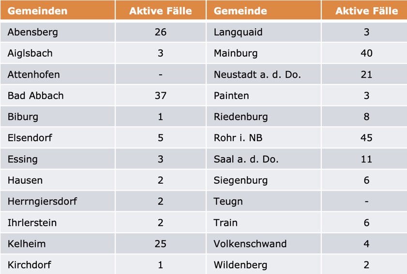 (ty) Im Kreis Kelheim gibt es in Zusammenhang mit der Corona-Pandemie, wie berichtet, mittlerweile 41 Menschenleben zu beklagen. Unter Verweis auf Daten des Gesundheitsamts teilte das Landratsamt heute mit, dass – Stand gestern, 16 Uhr – die Zahl der im Kreis Kelheim positiv auf den neuartigen Erreger getesteten Menschen bei insgesamt 2268 liegt – das sind 46 mehr als gestern gemeldet. 1971 hiesige Corona-Patienten (gestern: 1951) gelten mittlerweile als genesen und sind aus der Quarantäne entlassen. Derzeit gibt es 256 aktive Corona-Fälle im Landkreis (gestern: 230). Zahlen aus den einzelnen Gemeinden zeigt die Tabelle unten. Mittlerweile gilt ein bayernweiter Lock-Down, der unter anderem nächtliche Ausgangssperren bedeutet.