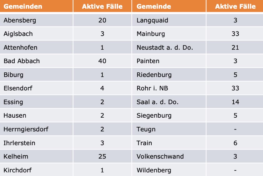 (ty) Im Kreis Kelheim gibt es in Zusammenhang mit der Corona-Pandemie, wie berichtet, mittlerweile 41 Menschenleben zu beklagen. Unter Verweis auf Daten des Gesundheitsamts teilte das Landratsamt heute mit, dass – Stand gestern, 16 Uhr – die Zahl der im Kreis Kelheim positiv auf den neuartigen Erreger getesteten Menschen bei insgesamt 2291 liegt – das sind 23 mehr als gestern gemeldet. 2020 hiesige Corona-Patienten (gestern: 1971) gelten mittlerweile als genesen und sind aus der Quarantäne entlassen. Derzeit gibt es 230 aktive Corona-Fälle im Landkreis (gestern: 256). Zahlen aus den einzelnen Gemeinden zeigt die Tabelle unten. Mittlerweile gilt ein bayernweiter Lock-Down, der unter anderem nächtliche Ausgangssperren bedeutet.