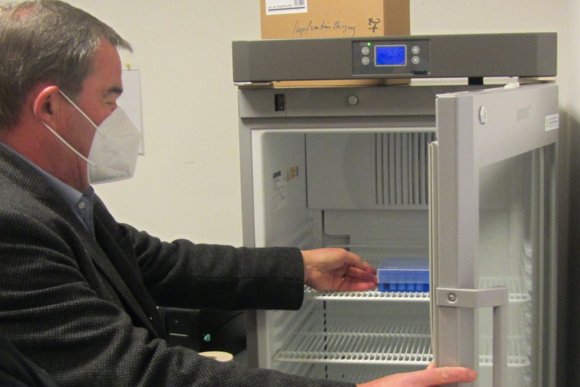 Landrat Albert Gürtner am Kühlschrank mit den ersten gelieferten Impfstoff-Dosen für den Landkreis.