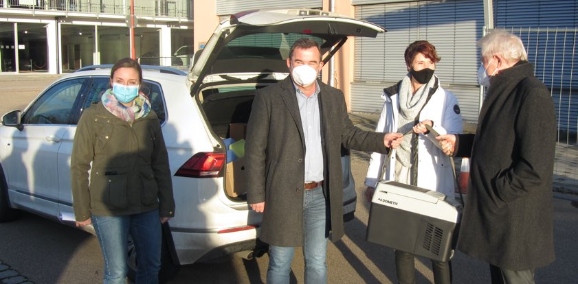 Impf-Zentrum-Mitarbeiterin Silvia Duckstein (von links), Landrat Albert Gürtner, Impf-Zentrum-Mitarbeiterin Andrea Hainzinger und Peter Korzinek, der ärztliche Leiter der beiden hiesigen Impf-Zentren, mit der Impfstoff-Lieferung, die in einer speziellen Tasche ankam.