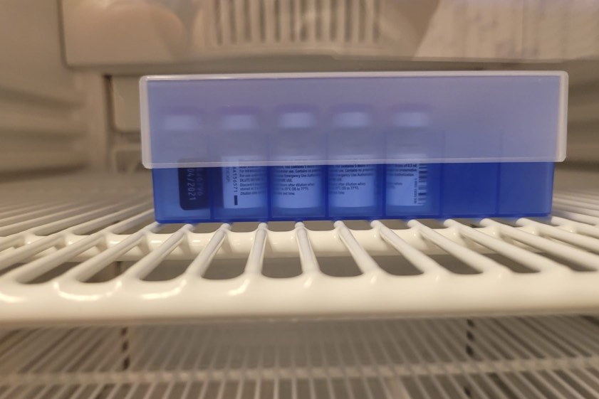 Die erste Lieferung mit Corona-Impfstoff für den Landkreis Pfaffenhofen; gelagert in einem Kühlschrank.