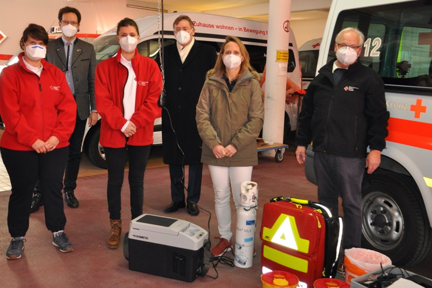 Landrat Peter von der Grün und der BRK-Kreisverbands-Vorsitzende Bernhard Gmehling nahmen den mobilen Impfstart zum Anlass, um den Mitarbeitern des Roten Kreuzes noch vor dem ersten Ausrücken für ihr Engagement zu danken. "Der Impfstart heute gibt uns Hoffnung auf ein Ende der Pandemie" – mit diesen Worten richtete sich der Landrat an die Helfer des BRK und betonte, dass die Vorbereitung des Impfstarts ein großer Kraftakt gewesen sei. "Unsere Partner, das BRK und das Kreiskrankenhaus, haben hervorragende Arbeit geleistet", betonte er.