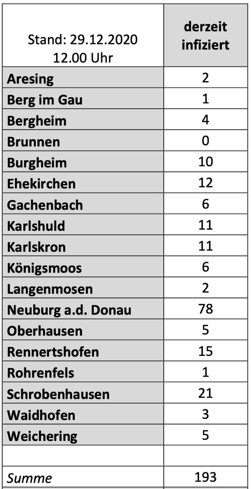 (ty) Im Kreis Neuburg-Schrobenhausen gibt es in Zusammenhang mit der Corona-Pandemie, wie berichtet, mittlerweile 47 Menschenleben zu beklagen. Die weitere Situation in dem Kreis stellt sich nach Angaben des Landratsamts wie folgt dar: Bislang – Stand: heute, 12 Uhr – wurden 2144 Landkreis-Bürger positiv auf den neuartigen Erreger getestet. Die Zahl hat sich seit der gestrigen Meldung um 22 erhöht. Von den Infizierten gelten mittlerweile 1904 als genesen – das sind 40 mehr als gestern gemeldet. Momentan gibt es in dem Landkreis 193 aktive Corona-Fälle (gestern: 211). Aktuelle Zahlen aus den Gemeinden zeigt die Tabelle unten. Mittlerweile gilt ein bayernweiter Lock-Down, der unter anderem nächtliche Ausgangssperren bedeutet.