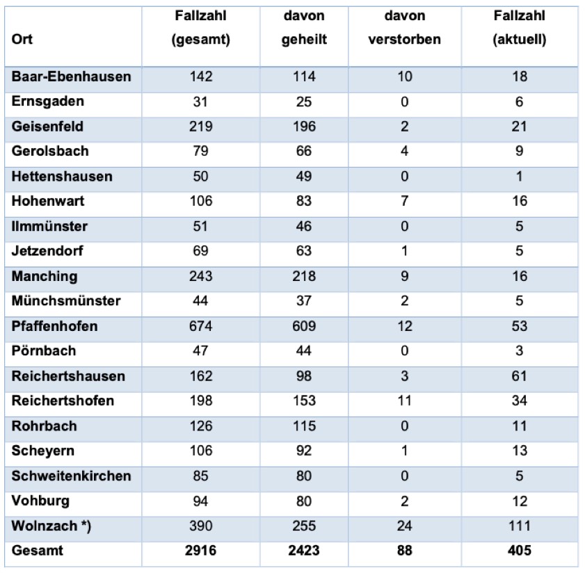 * Das Landratsamt weist vor dem Hintergrund der zahlreichen Todesfälle explizit darauf hin, dass die für Wolnzach angeführten Zahlen inklusive des "Haus der Generationen" zu verstehen sind. Allerdings fließen auch die Zahlen aus sämtlichen anderen Senioren- und Pflegeheimen im Kreis Pfaffenhofen in die Corona-Statistik der jeweiligen Gemeinde ein.
