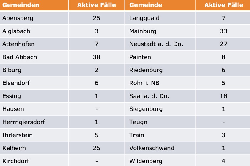 (ty) Im Kreis Kelheim gibt es in Zusammenhang mit der Corona-Pandemie ein weiteres Menschenleben zu beklagen. Wie das Landratsamt heute mitteilte, steigt damit die Zahl der mit dem Virus infizierten Landkreis-Bürger, die gestorben sind, auf nunmehr 51. Unter Verweis auf Daten des Gesundheitsamts teilte das Landratsamt heute mit, dass – Stand gestern, 16 Uhr – die Zahl der im Kreis Kelheim positiv auf den neuartigen Erreger getesteten Menschen bei insgesamt 2453 liegt – das sind 46 mehr als gestern gemeldet. 2176 hiesige Corona-Patienten (gestern: 2157) gelten mittlerweile als genesen und sind aus der Quarantäne entlassen. Derzeit gibt es 226 aktive Corona-Fälle im Landkreis (gestern: 200). Zahlen aus den einzelnen Gemeinden zeigt die Tabelle unten.