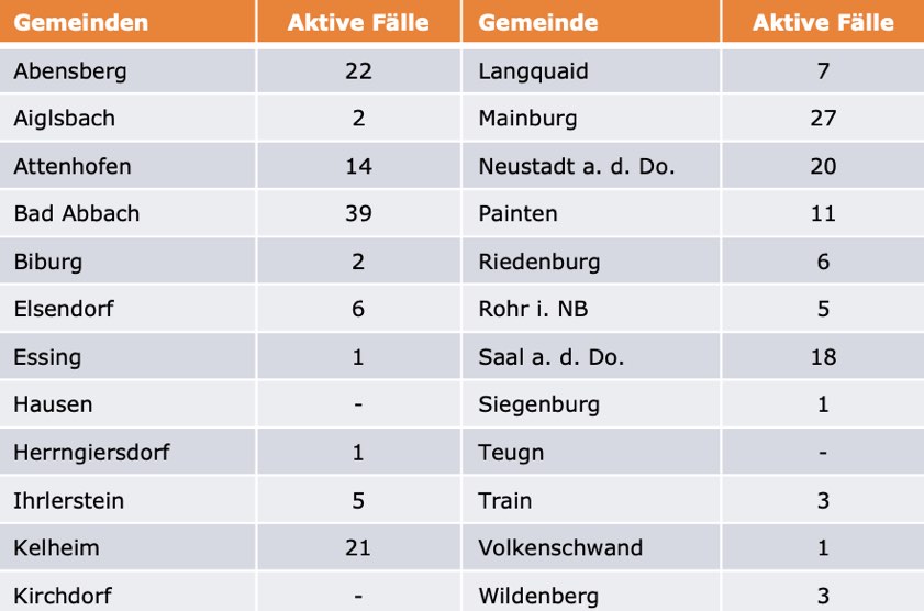 (ty) Im Kreis Kelheim gibt es in Zusammenhang mit der Corona-Pandemie, wie berichtet, mittlerweile 51 Menschenleben zu beklagen. Unter Verweis auf Daten des Gesundheitsamts teilte das Landratsamt heute mit, dass – Stand gestern, 16 Uhr – die Zahl der im Kreis Kelheim positiv auf den neuartigen Erreger getesteten Menschen bei insgesamt 2471 liegt – das sind 18 mehr als gestern gemeldet. 2205 hiesige Corona-Patienten (gestern: 2176) gelten mittlerweile als genesen und sind aus der Quarantäne entlassen. Derzeit gibt es 215 aktive Corona-Fälle im Landkreis (gestern: 226). Zahlen aus den einzelnen Gemeinden zeigt die Tabelle unten.