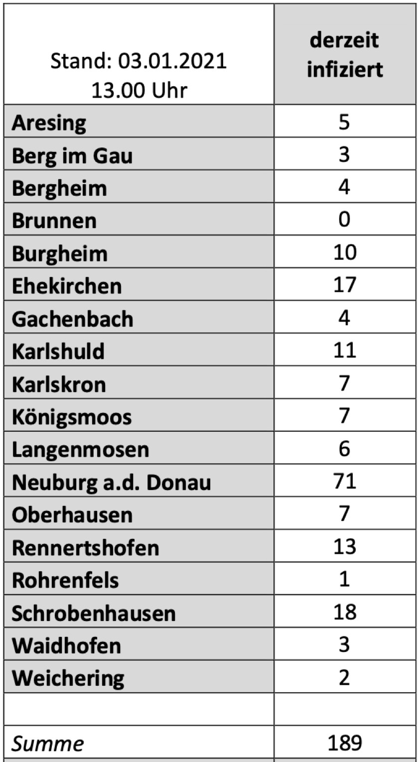 (ty) Im Kreis Neuburg-Schrobenhausen gibt es in Zusammenhang mit der Corona-Pandemie, wie berichtet, mittlerweile 47 Menschenleben zu beklagen. Die weitere Situation in dem Kreis stellt sich nach Angaben des Landratsamts wie folgt dar: Bislang – Stand: heute, 13 Uhr – wurden 2256 Landkreis-Bürger positiv auf den neuartigen Erreger getestet. Die Zahl hat sich seit der gestrigen Meldung um 27 erhöht. Von den Infizierten gelten mittlerweile 2020 als genesen – das sind 20 mehr als gestern gemeldet. Momentan gibt es in dem Landkreis 189 aktive Corona-Fälle (gestern: 182). Aktuelle Zahlen aus den Gemeinden zeigt die Tabelle unten.