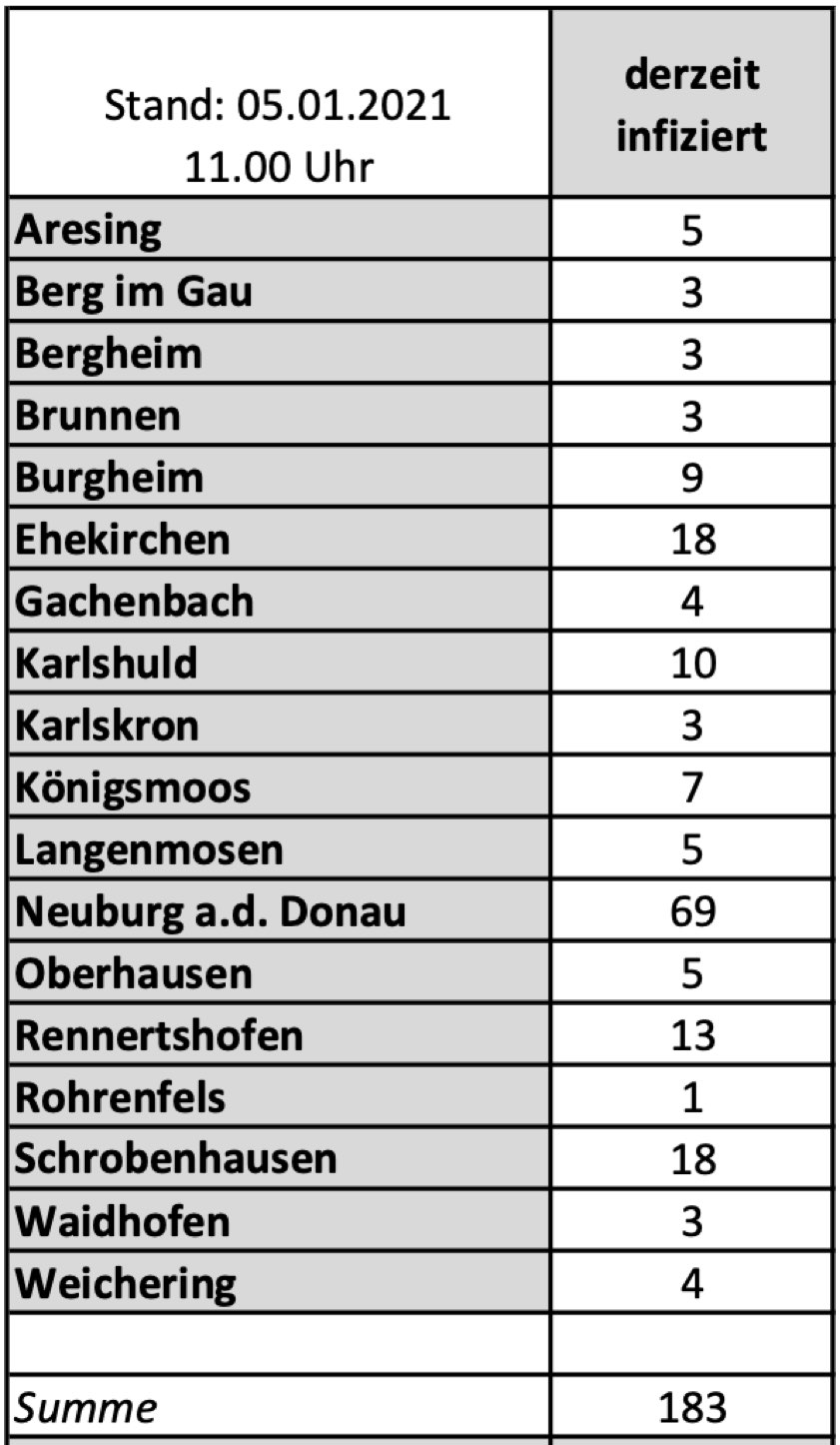 (ty) Im Kreis Neuburg-Schrobenhausen gibt es in Zusammenhang mit der Corona-Pandemie, wie berichtet, mittlerweile 47 Menschenleben zu beklagen. Die weitere Situation in dem Kreis stellt sich nach Angaben des Landratsamts wie folgt dar: Bislang – Stand: heute, 11 Uhr – wurden 2277 Landkreis-Bürger positiv auf den neuartigen Erreger getestet. Die Zahl hat sich seit der gestrigen Meldung um 17 erhöht. Von den Infizierten gelten mittlerweile 2047 als genesen – das sind 15 mehr als gestern gemeldet. Momentan gibt es in dem Landkreis 183 aktive Corona-Fälle (gestern: 181). Aktuelle Zahlen aus den Gemeinden zeigt die Tabelle unten.