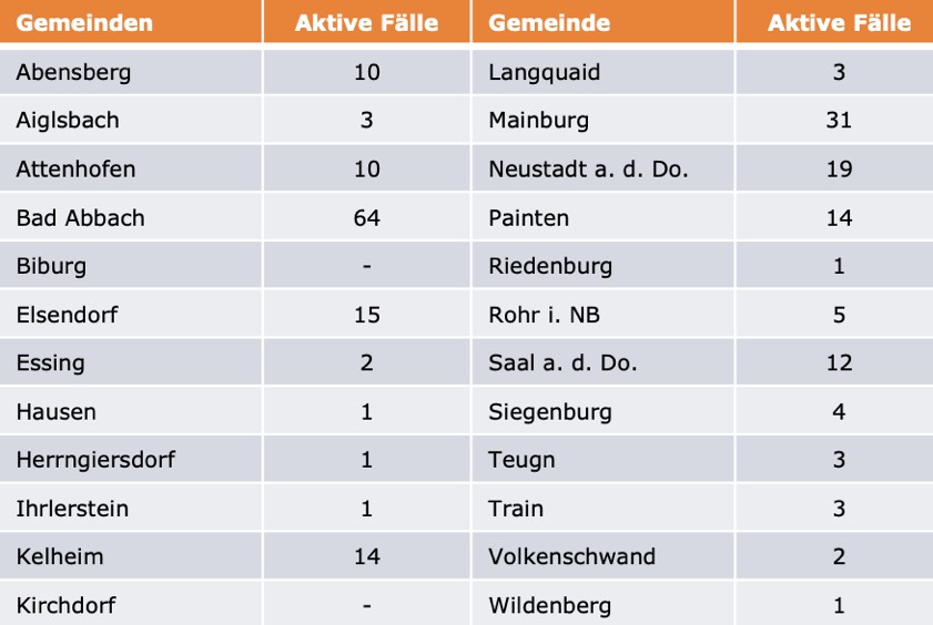 (ty) Im Kreis Kelheim gibt es in Zusammenhang mit der Corona-Pandemie ein weiteres Menschenleben zu beklagen. Wie das Landratsamt heute mitteilte, erhöht sich damit die Zahl der mit dem Virus infizierten Landkreis-Bürger, die gestorben sind, auf nunmehr 53. Unter Verweis auf Daten des Gesundheitsamts teilte das Landratsamt heute mit, dass – Stand gestern, 16 Uhr – die Zahl der im Kreis Kelheim positiv auf den neuartigen Erreger getesteten Menschen bei insgesamt 2599 liegt – das sind 21 mehr als gestern gemeldet. 2327 hiesige Corona-Patienten (gestern: 2305) gelten mittlerweile als genesen und sind aus der Quarantäne entlassen. Derzeit gibt es 219 aktive Corona-Fälle im Landkreis (gestern: 221). Zahlen aus den einzelnen Gemeinden zeigt die Tabelle unten.