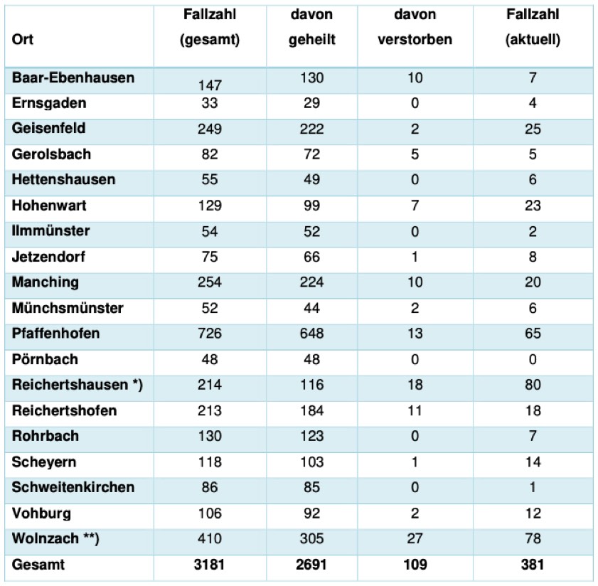 * Das Landratsamt weist vor dem Hintergrund der zahlreichen Todesfälle explizit darauf hin, dass die für Wolnzach und Reichertshausen angeführten Zahlen inklusive "Haus der Generationen" und "Haus Raphael" zu verstehen sind. Allerdings fließen auch die Zahlen aus sämtlichen anderen Senioren- und Pflegeheimen im Kreis Pfaffenhofen in die Corona-Statistik der jeweiligen Gemeinde ein.
