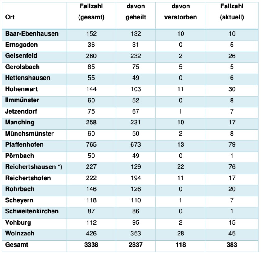 * Das Landratsamt weist vor dem Hintergrund der zahlreichen Todesfälle darauf hin, dass die für Wolnzach und Reichertshausen angeführten Zahlen inklusive "Haus der Generationen" und "Haus Raphael" zu verstehen sind. Allerdings fließen auch die Zahlen aus sämtlichen anderen Senioren- und Pflegeheimen im Kreis Pfaffenhofen in die Corona-Statistik der jeweiligen Gemeinde ein.