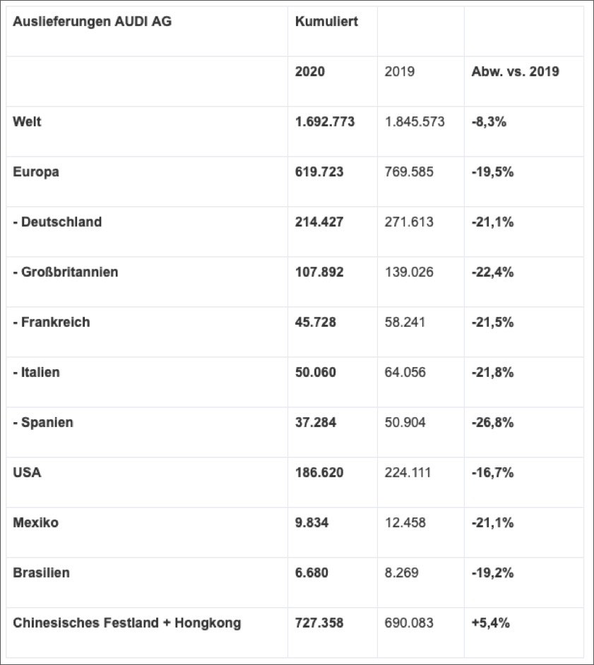 (ty) Mit dem erfolgreichsten Quartal der Unternehmens-Geschichte hat die Audi-AG das vergangene Jahr bei den Pkw-Auslieferungen abgeschlossen: Zwischen Oktober und Dezember übergab der Ingolstädter Autobauer laut heutiger Mitteilung 505 583 Autos an Kunden – zum ersten Mal mehr als eine halbe Million in einem Quartal. "In einem herausfordernden Jahr, das weltweit von Einschränkungen durch die Corona-Pandemie geprägt war", habe man 2020 insgesamt 1 692 773 Fahrzeuge ausgeliefert – ein Rückgang von 8,3 Prozent gegenüber dem Vorjahr. In China fuhr Audi mit 727 358 Auslieferungen (plus 5,4 Prozent) dennoch einen neuen Bestwert ein. In Europa steht ein Minus von 19,5 Prozent zu Buche, in Deutschland von gut 21 Prozent (siehe Tabelle unten).