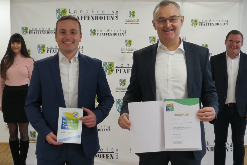 (ty) Die Firma "Wema Zerspanungs-Werkzeuge" aus Pfaffenhofen nimmt am so genannten Umwelt-Pakt Bayern teil. Landrat Albert Gürtner (FW) überreichte die entsprechende Urkunde an die beiden Geschäftsführer: Max Prem und dessen Sohn Florian Prem (Foto oben). Im Rahmen des von der bayerischen Regierung sowie der bayerischen Wirtschaft abgeschlossenen "Umwelt-Pakts" verpflichten sich die teilnehmenden Unternehmen zu einer qualifizierten, freiwilligen Umweltleistung – sie werden dann vom bayerischen Staatsministerium für Umwelt, Gesundheit und Verbraucherschutz als Teilnehmer bestätigt.