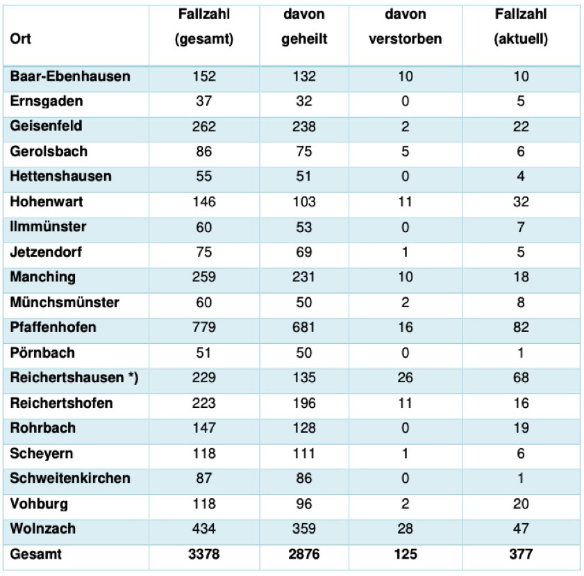 * Das Landratsamt weist vor dem Hintergrund der zahlreichen Todesfälle darauf hin, dass die für Wolnzach und Reichertshausen angeführten Zahlen inklusive "Haus der Generationen" und "Haus Raphael" zu verstehen sind. Allerdings fließen auch die Zahlen aus sämtlichen anderen Senioren- und Pflegeheimen im Kreis Pfaffenhofen in die Corona-Statistik der jeweiligen Gemeinde ein.
