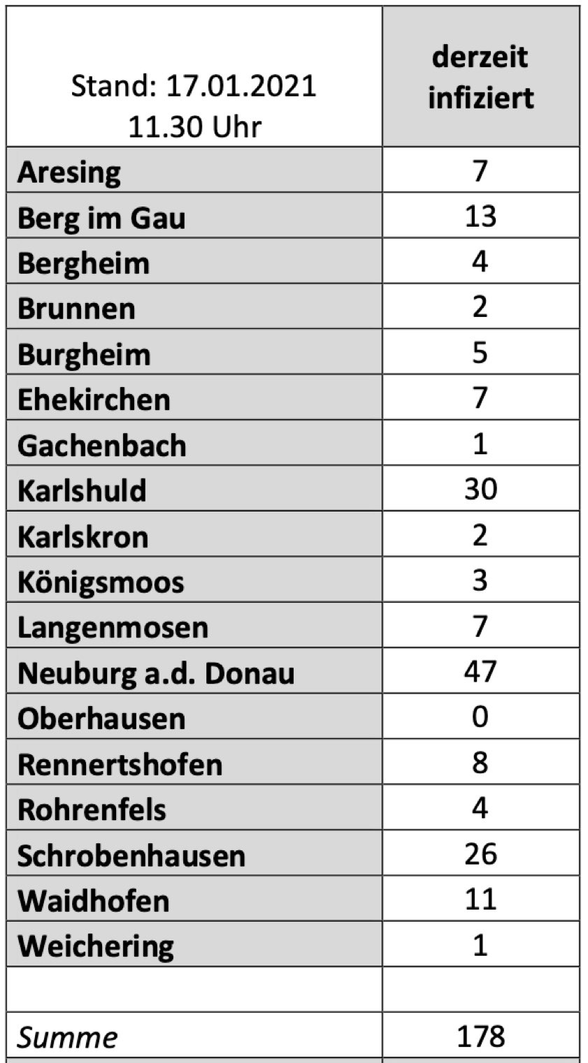 (ty) Im Kreis Neuburg-Schrobenhausen gibt es in Zusammenhang mit der Corona-Pandemie, wie berichtet, mittlerweile 57 Menschenleben zu beklagen. Die weitere Situation in dem Kreis stellt sich nach aktuellen Angaben des Landratsamts wie folgt dar: Bislang – Stand: heute, 11.30 Uhr – wurden 2525 Landkreis-Bürger positiv auf den neuartigen Erreger getestet. Die Zahl hat sich seit der gestrigen Meldung um eins erhöht. Von den Infizierten gelten mittlerweile 2290 als genesen – das sind 13 mehr als gestern gemeldet. Momentan gibt es in dem Landkreis 178 aktive Corona-Fälle (gestern: 190). Aktuelle Zahlen aus den Gemeinden zeigt die Tabelle unten.