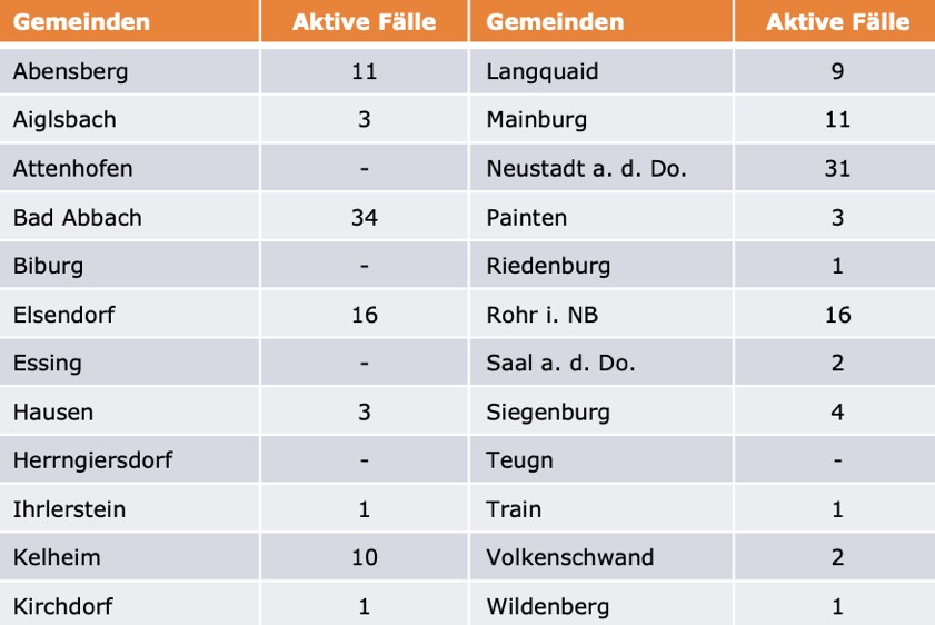 (ty) Im Kreis Kelheim gibt es in Zusammenhang mit der Corona-Pandemie ein weiteres Menschenleben zu beklagen. Wie das Landratsamt gegenüber unserer Redaktion mitteilte, ist eine mit dem Erreger infizierte Frau (Jahrgang 1947) gestorben, die nicht unter Vorerkrankungen litt. Damit erhöht sich die Zahl der mit dem Virus infizierten Landkreis-Bürger, die gestorben sind, auf nunmehr 64. Unter Verweis auf Daten des Gesundheitsamts teilte das Landratsamt heute mit, dass – Stand gestern, 16 Uhr – die Zahl der im Kreis Kelheim positiv auf den neuartigen Erreger getesteten Menschen bei insgesamt 2910 liegt – das sind fünf mehr als gestern gemeldet. 2686 hiesige Corona-Patienten (gestern: 2643) gelten mittlerweile als genesen und sind aus der Quarantäne entlassen. Derzeit gibt es 160 aktive Corona-Fälle im Landkreis (gestern: 199). Zahlen aus den einzelnen Gemeinden zeigt die Tabelle unten.