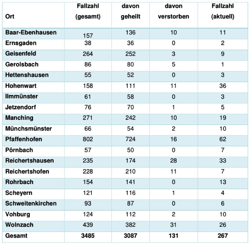 (ty) In Zusammenhang mit der Corona-Pandemie gibt es im Kreis Pfaffenhofen ein weiteres Menschenleben zu beklagen. Wie das Landratsamt heute gegenüber unserer Zeitung mitteilte, ist ein 76 Jahre alter Mann aus Wolnzach gestorben, der mit dem Virus infiziert war. Damit erhöht sich die Zahl der mit dem Erreger infizierten Landkreis-Bürger, die gestorben sind, auf nunmehr 131. Das Landratsamt veröffentlicht eine tägliche Übersicht (siehe unten), in welchen Gemeinden die mit dem Virus infizierten Menschen, die gestorben sind, gelebt haben beziehungsweise wie viele bestätigte Infektionsfälle und genesene Patienten es in welcher Kommune gibt. Die Zahl der Landkreis-Bürger, die positiv auf den neuartigen Erreger getestet worden sind, hat sich seit der Meldung von gestern um fünf erhöht und beträgt nunmehr 3485.