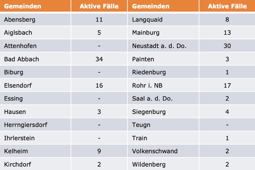 (ty) Im Kreis Kelheim gibt es in Zusammenhang mit der Corona-Pandemie ein weiteres Menschenleben zu beklagen. Wie das Landratsamt gegenüber unserer Redaktion mitteilte, ist eine mit dem Erreger infizierte Frau (Jahrgang 1929) gestorben, die unter Vorerkrankungen litt. Damit erhöht sich die Zahl der mit dem Virus infizierten Landkreis-Bürger, die gestorben sind, auf nunmehr 65. Unter Verweis auf Daten des Gesundheitsamts teilte das Landratsamt heute mit, dass – Stand gestern, 16 Uhr – die Zahl der im Kreis Kelheim positiv auf den neuartigen Erreger getesteten Menschen bei insgesamt 2925 liegt – das sind 15 mehr als gestern gemeldet. 2697 hiesige Corona-Patienten (gestern: 2686) gelten mittlerweile als genesen und sind aus der Quarantäne entlassen. Derzeit gibt es 163 aktive Corona-Fälle im Landkreis (gestern: 160). Zahlen aus den einzelnen Gemeinden zeigt die Tabelle unten.