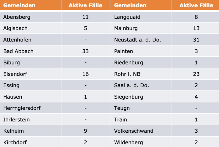 (ty) Im Kreis Kelheim gibt es in Zusammenhang mit der Corona-Pandemie, wie berichtet, mittlerweile 65 Menschenleben zu beklagen. Unter Verweis auf Daten des Gesundheitsamts teilte das Landratsamt heute mit, dass – Stand gestern, 16 Uhr – die Zahl der im Kreis Kelheim positiv auf den neuartigen Erreger getesteten Menschen bei insgesamt 2938 liegt – das sind 13 mehr als gestern gemeldet. 2705 hiesige Corona-Patienten (gestern: 2697) gelten mittlerweile als genesen und sind aus der Quarantäne entlassen. Derzeit gibt es 168 aktive Corona-Fälle im Landkreis (gestern: 160). Zahlen aus den einzelnen Gemeinden zeigt die Tabelle unten.