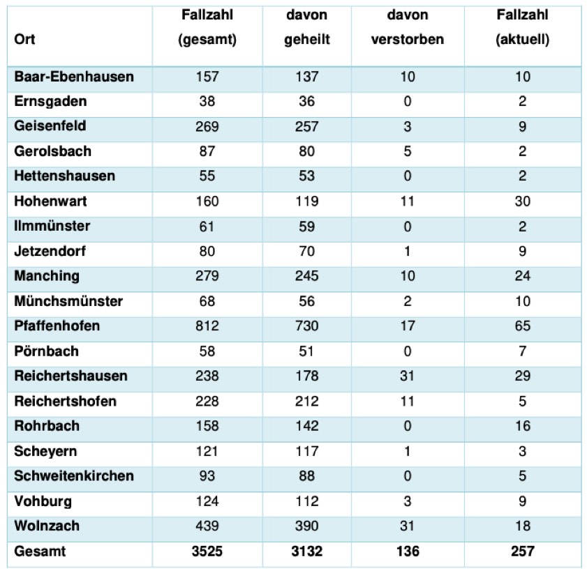 (ty) In Zusammenhang mit der Corona-Pandemie gibt es im Kreis Pfaffenhofen zwei weitere Menschenleben zu beklagen. Wie das Landratsamt heute gegenüber unserer Zeitung mitteilte, sind ein 89-jähriger Mann aus Reichertshausen und eine 82-jährige Frau aus Pfaffenhofen gestorben, die mit dem Virus infiziert waren. Damit erhöht sich die Zahl der mit dem Erreger infizierten Landkreis-Bürger, die gestorben sind, auf nunmehr 136. Das Landratsamt veröffentlicht eine tägliche Übersicht (siehe unten), in welchen Gemeinden die mit dem Virus infizierten Menschen, die gestorben sind, gelebt haben beziehungsweise wie viele bestätigte Infektionsfälle und genesene Patienten es in welcher Kommune gibt. Die Zahl der Landkreis-Bürger, die positiv auf den neuartigen Erreger getestet worden sind, hat sich seit der Meldung von gestern um 20 erhöht und beträgt nunmehr 3525.