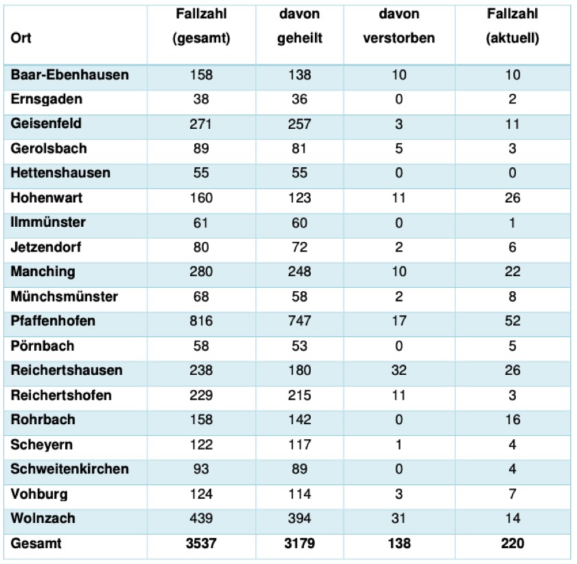 (ty) In Zusammenhang mit der Corona-Pandemie gibt es im Kreis Pfaffenhofen zwei weitere Menschenleben zu beklagen. Wie das Landratsamt heute gegenüber unserer Zeitung mitteilte, sind ein 77-jähriger Mann aus Jetzendorf und ein 83-jähriger Mann aus Reichertshausen gestorben, die mit dem Virus infiziert waren. Damit erhöht sich die Zahl der mit dem Erreger infizierten Landkreis-Bürger, die gestorben sind, auf nunmehr 138. Das Landratsamt veröffentlicht eine tägliche Übersicht (siehe unten), in welchen Gemeinden die mit dem Virus infizierten Menschen, die gestorben sind, gelebt haben beziehungsweise wie viele bestätigte Infektionsfälle und genesene Patienten es in welcher Kommune gibt. Die Zahl der Landkreis-Bürger, die positiv auf den neuartigen Erreger getestet worden sind, hat sich seit der Meldung von gestern um zwölf erhöht und beträgt nunmehr 3537.