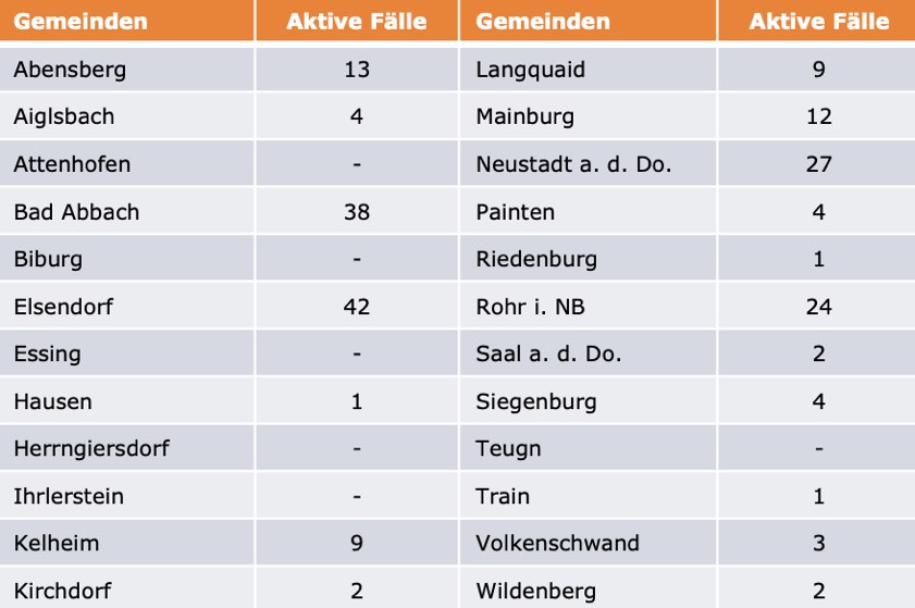 (ty) Im Kreis Kelheim gibt es in Zusammenhang mit der Corona-Pandemie, wie berichtet, mittlerweile 65 Menschenleben zu beklagen. Unter Verweis auf Daten des Gesundheitsamts teilte das Landratsamt heute mit, dass – Stand gestern, 16 Uhr – die Zahl der im Kreis Kelheim positiv auf den neuartigen Erreger getesteten Menschen bei insgesamt 2978 liegt – das sind 40 mehr als gestern gemeldet. 2715 hiesige Corona-Patienten (gestern: 2705) gelten mittlerweile als genesen und sind aus der Quarantäne entlassen. Derzeit gibt es 198 aktive Corona-Fälle im Landkreis (gestern: 168). Zahlen aus den einzelnen Gemeinden zeigt die Tabelle unten.
