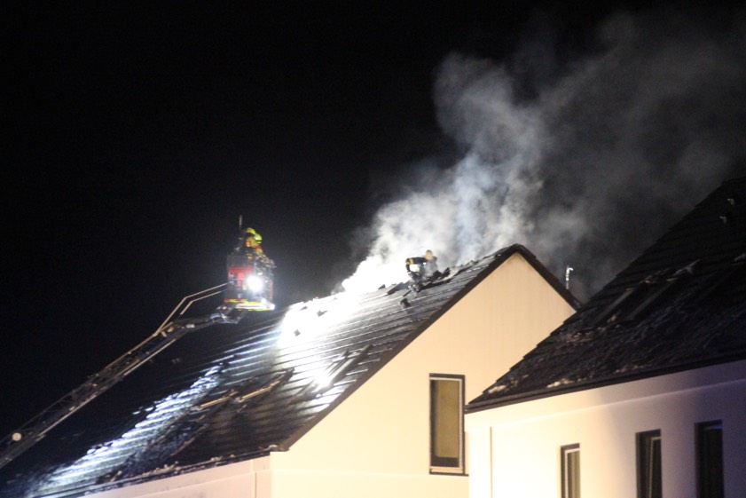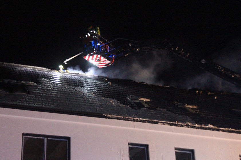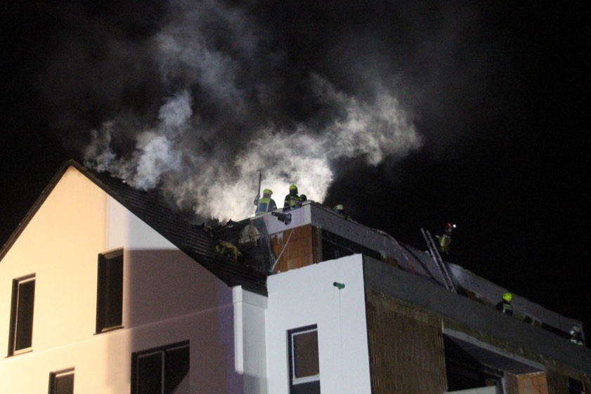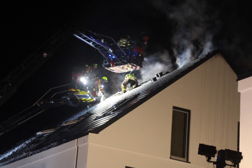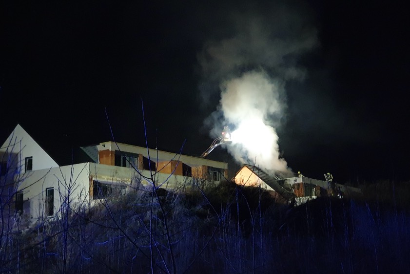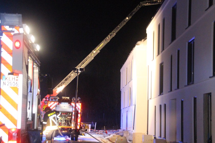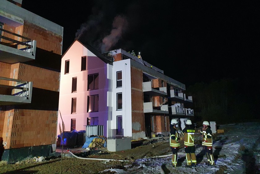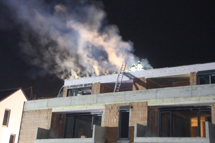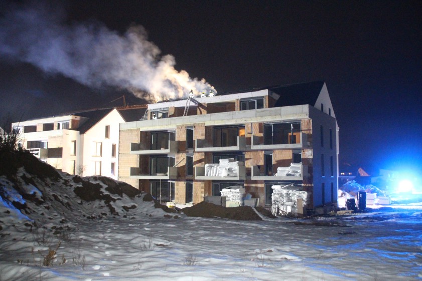 Der Dachstuhl des im Rohbau befindlichen Gebäudes stand gestern Abend in Flammen. Ursache noch unklar, Ermittlungen laufen.