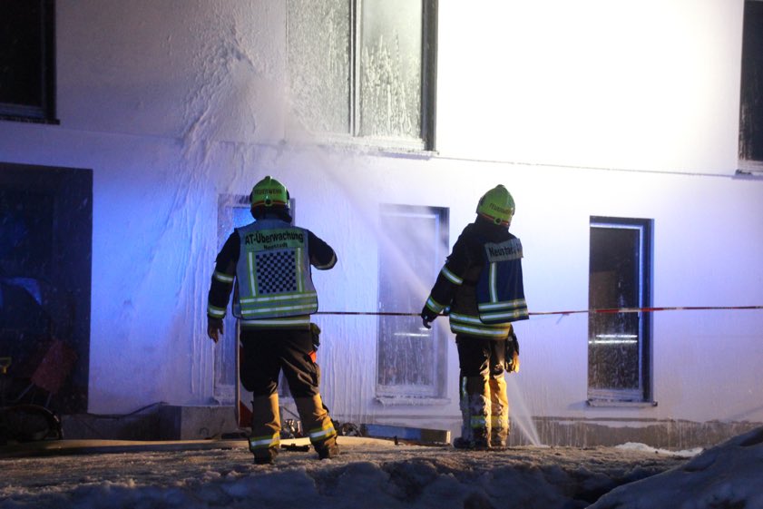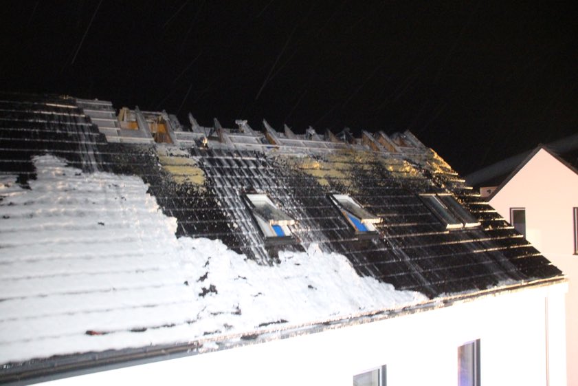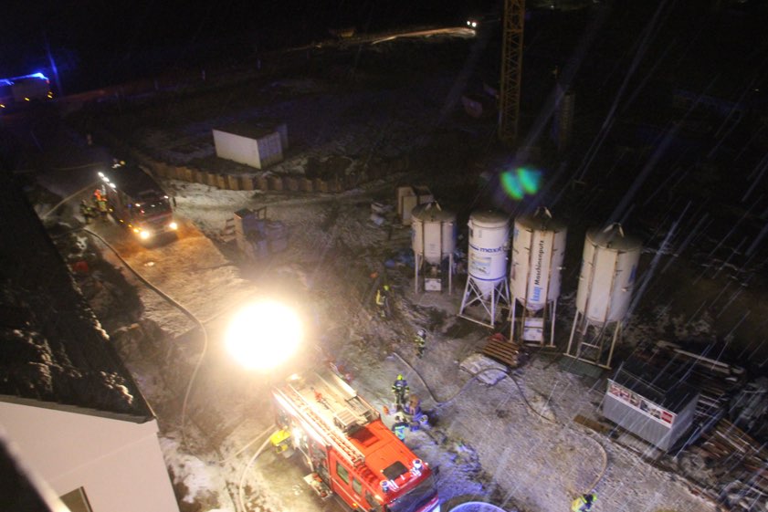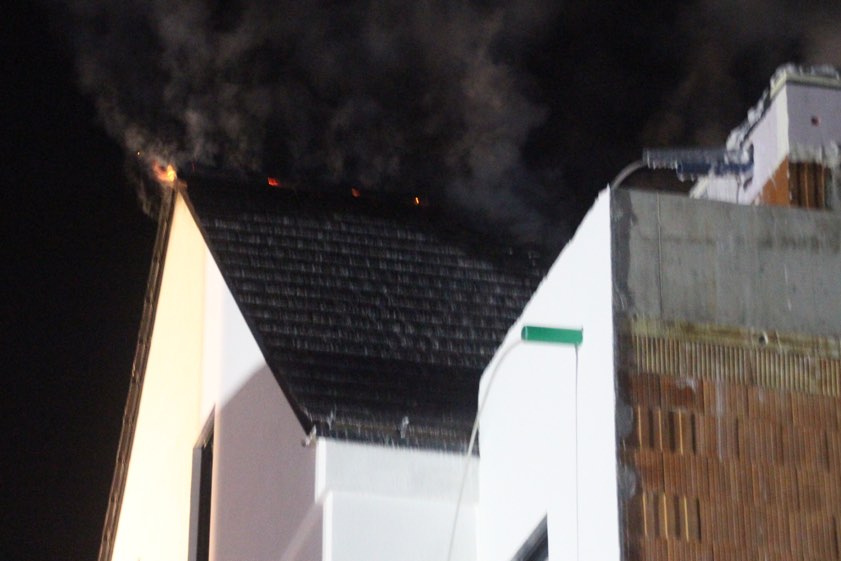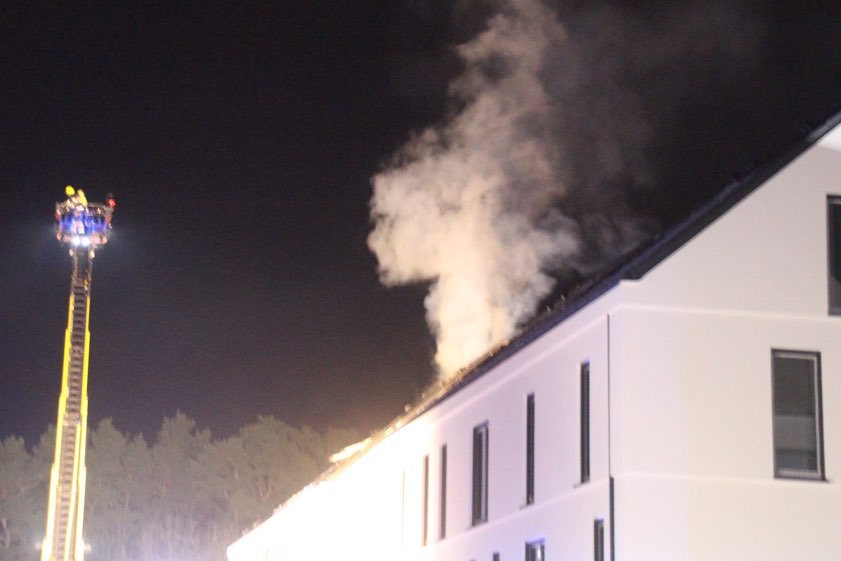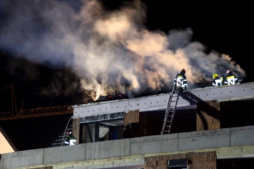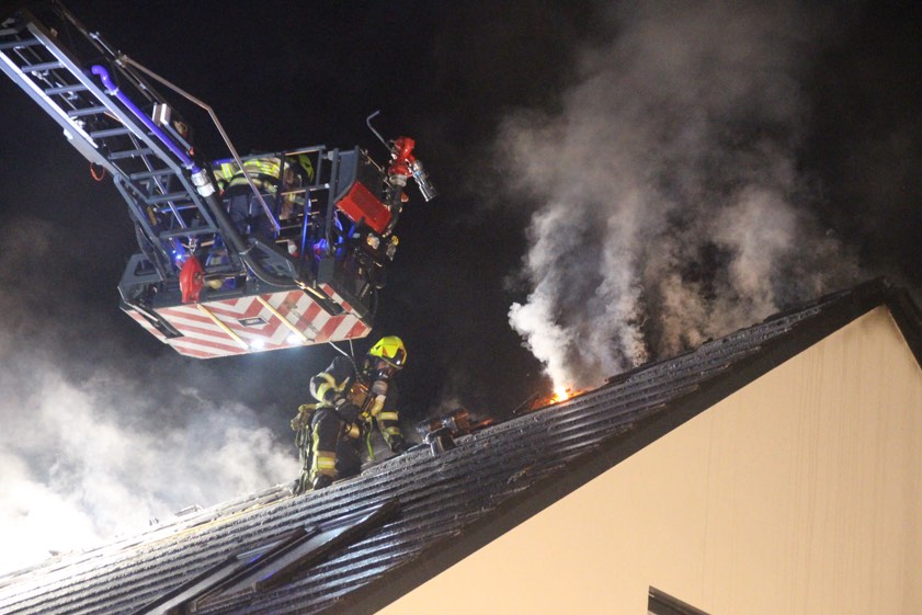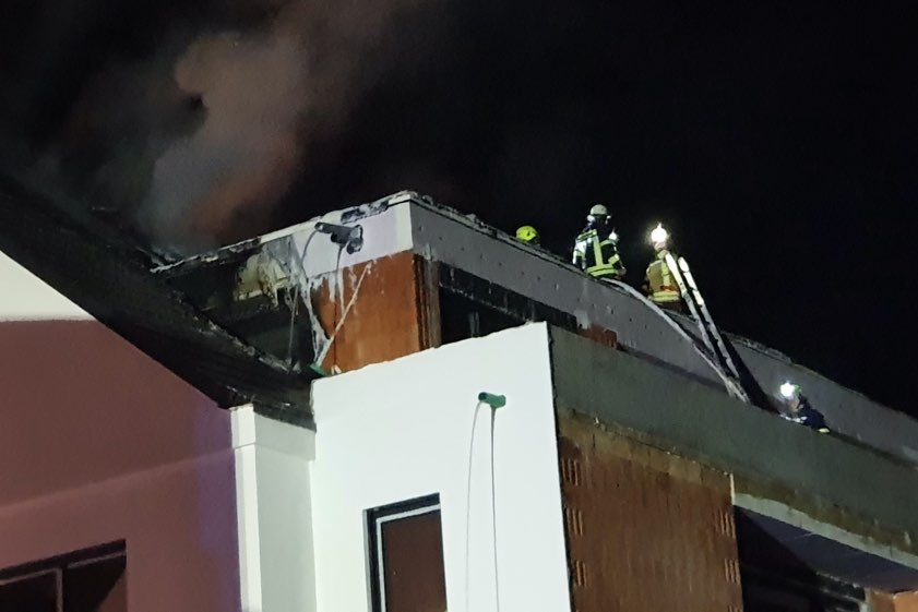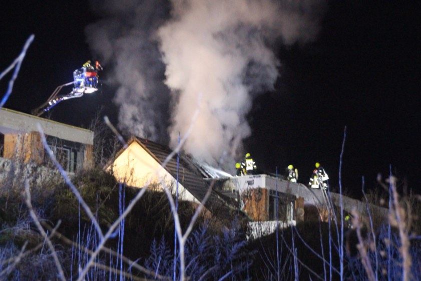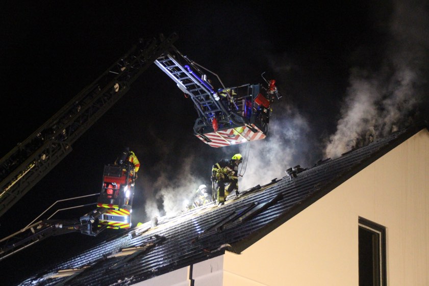 Der Dachstuhl des im Rohbau befindlichen Gebäudes stand gestern Abend in Flammen. Ursache noch unklar, Ermittlungen laufen.
