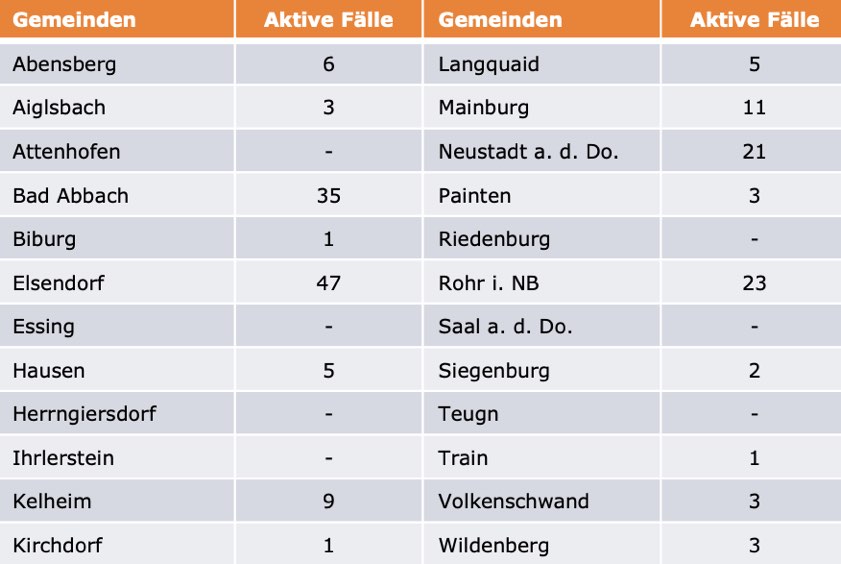 (ty) Im Kreis Kelheim gibt es in Zusammenhang mit der Corona-Pandemie, wie berichtet, mittlerweile 69 Menschenleben zu beklagen. Unter Verweis auf Daten des Gesundheitsamts teilte das Landratsamt heute mit, dass – Stand gestern, 16 Uhr – die Zahl der im Kreis Kelheim positiv auf den neuartigen Erreger getesteten Menschen bei insgesamt 3021 liegt – das sind zehn mehr als gestern gemeldet. 2773 hiesige Corona-Patienten (gestern: 2765) gelten mittlerweile als genesen und sind aus der Quarantäne entlassen. Derzeit gibt es 179 aktive Corona-Fälle im Landkreis (gestern: 177). Zahlen aus den einzelnen Gemeinden zeigt die Tabelle unten.