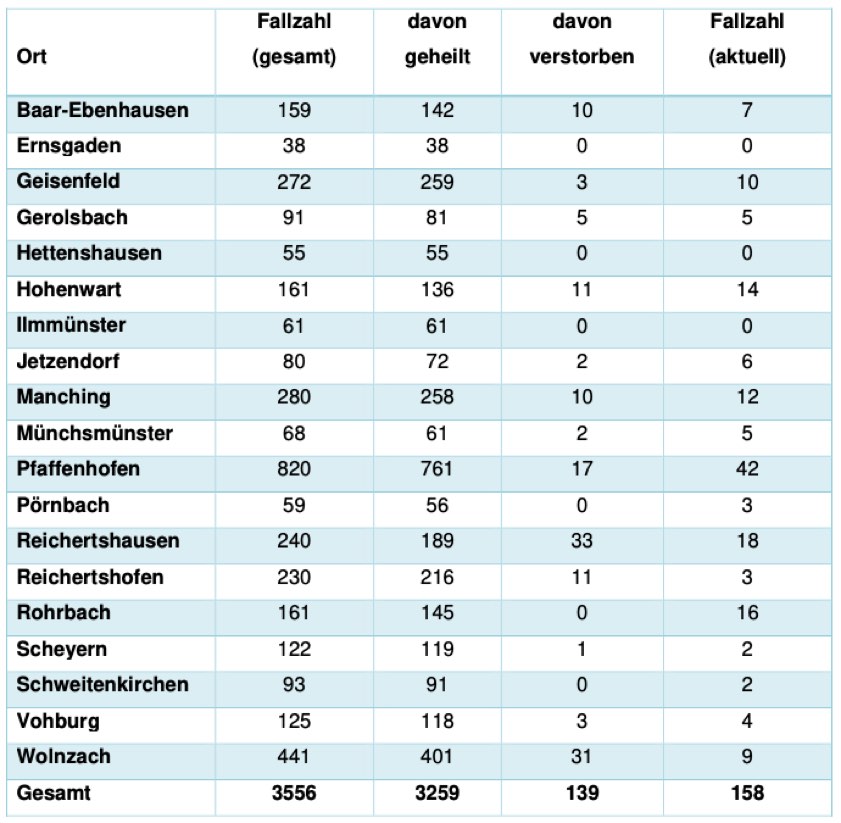 (ty) In Zusammenhang mit der Corona-Pandemie gibt es im Kreis Pfaffenhofen ein weiteres Menschenleben zu beklagen. Wie das Landratsamt heute gegenüber unserer Zeitung mitteilte, ist übers Wochenende eine 95 Jahre alte Frau aus der Gemeinde Reichertshausen gestorben, die mit dem Virus infiziert war. Damit erhöht sich die Zahl der mit dem Erreger infizierten Landkreis-Bürger, die gestorben sind, auf nunmehr 139. Das Landratsamt veröffentlicht eine tägliche Übersicht (siehe unten), in welchen Gemeinden die mit dem Virus infizierten Menschen, die gestorben sind, gelebt haben beziehungsweise wie viele bestätigte Infektionsfälle und genesene Patienten es in welcher Kommune gibt. Die Zahl der Landkreis-Bürger, die positiv auf den neuartigen Erreger getestet worden sind, hat sich seit der Meldung vom Freitag um 19 erhöht und beträgt nunmehr 3556.