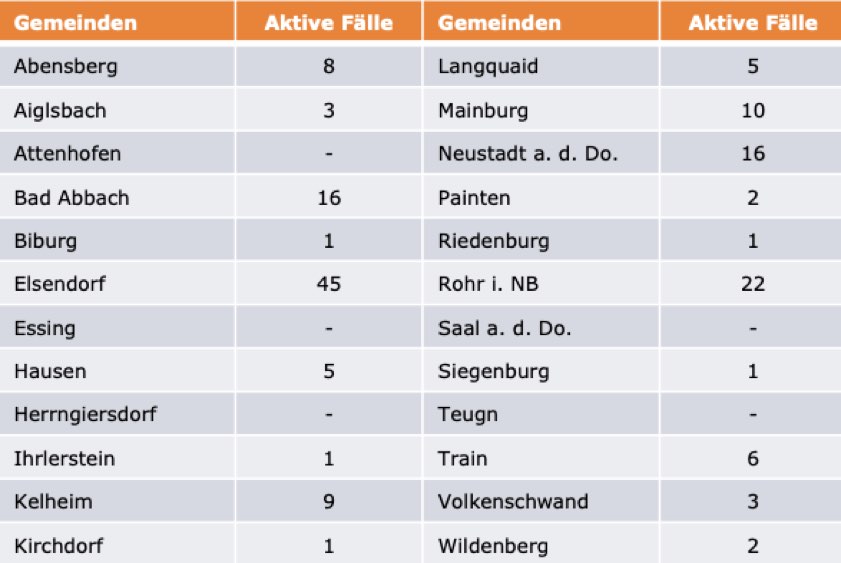 (ty) Im Kreis Kelheim gibt es in Zusammenhang mit der Corona-Pandemie zwei weitere Menschenleben zu beklagen. Wie das Landratsamt heute gegenüber unserer Redaktion mitteilte, sind zwei unter Vorerkrankungen leidende Männer (Jahrgang 1929 und 1937) gestorben, die mit dem Virus infiziert waren. Damit erhöht sich die Zahl der infizierten Landkreis-Bürger, die gestorben sind, auf nunmehr 71. Unter Verweis auf Daten des Gesundheitsamts teilte das Landratsamt heute mit, dass – Stand gestern, 16 Uhr – die Zahl der im Kreis Kelheim positiv auf den neuartigen Erreger getesteten Menschen bei insgesamt 3032 liegt – das sind elf mehr als gestern gemeldet. 2804 hiesige Corona-Patienten (gestern: 2773) gelten mittlerweile als genesen und sind aus der Quarantäne entlassen. Derzeit gibt es 157 aktive Corona-Fälle im Landkreis (gestern: 179). Zahlen aus den einzelnen Gemeinden zeigt die Tabelle unten.