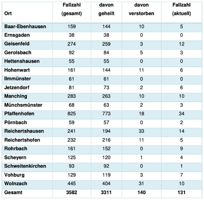 (ty) In Zusammenhang mit der Corona-Pandemie gibt es im Kreis Pfaffenhofen ein weiteres Menschenleben zu beklagen. Wie das Landratsamt heute gegenüber unserer Zeitung mitteilte, ist eine 101 Jahre alte Frau aus Pfaffenhofen gestorben, die mit dem Virus infiziert war. Damit erhöht sich die Zahl der mit dem Erreger infizierten Landkreis-Bürger, die gestorben sind, auf nunmehr 140. Das Landratsamt veröffentlicht eine tägliche Übersicht (siehe unten), in welchen Gemeinden die mit dem Virus infizierten Menschen, die gestorben sind, gelebt haben beziehungsweise wie viele bestätigte Infektionsfälle und genesene Patienten es in welcher Kommune gibt. Die Zahl der Landkreis-Bürger, die positiv auf den neuartigen Erreger getestet worden sind, hat sich seit der Meldung von gestern um zwölf erhöht und beträgt nunmehr 3582.