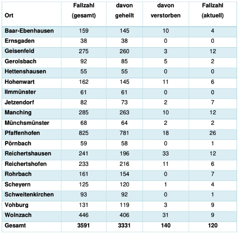 (ty) In Zusammenhang mit der Corona-Pandemie gibt es im Kreis Pfaffenhofen, wie berichtet, mittlerweile 140 Menschenleben zu beklagen. Das Landratsamt veröffentlicht eine tägliche Übersicht (siehe unten), in welchen Gemeinden die mit dem Virus infizierten Menschen, die gestorben sind, gelebt haben beziehungsweise wie viele bestätigte Infektionsfälle und genesene Patienten es in welcher Kommune gibt. Die Zahl der Landkreis-Bürger, die positiv auf den neuartigen Erreger getestet worden sind, hat sich seit der Meldung von gestern um neun erhöht und beträgt nunmehr 3591.