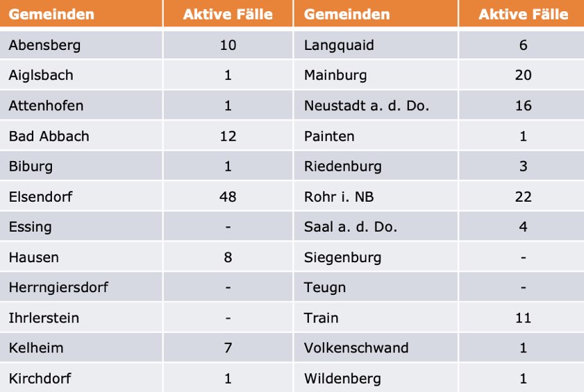 (ty) Im Kreis Kelheim gibt es in Zusammenhang mit der Corona-Pandemie laut Gesundheitsamt, wie berichtet, mittlerweile 74 Menschenleben zu beklagen. Unter Verweis auf Daten der Behörde teilte das Landratsamt heute mit, dass – Stand gestern, 16 Uhr – die Zahl der im Kreis Kelheim positiv auf den neuartigen Erreger getesteten Menschen bei insgesamt 3082 liegt – das sind 18 mehr als gestern gemeldet. 2834 hiesige Corona-Patienten (gestern: 2825) gelten mittlerweile als genesen und sind aus der Quarantäne entlassen. Derzeit gibt es 174 aktive Corona-Fälle im Landkreis (gestern: 165). Zahlen aus den einzelnen Gemeinden zeigt die Tabelle unten.