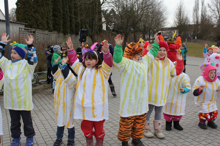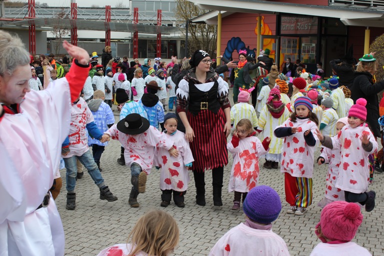 (ty) Mit einem bunten Faschingstreiben haben die Mädchen und Buben vom Kindergarten Maria Rast sowie die Erst- und Zweitklässler der Niederscheyerer Grundschule am Unsinnigen Donnerstag die närrische Zeit in Pfaffenhofen eröffnet. Ausgelassen tanzten die bunt maskierten Jecken in ihren farbenfrohen Kostümen gemeinsam mit ihrem Erzieher, den Erzieherinnen und Lehrerinnen zu bekannten Hits und sangen kräftig mit. Zum Abschluss des lustigen Treibens regnete Süßigkeiten.