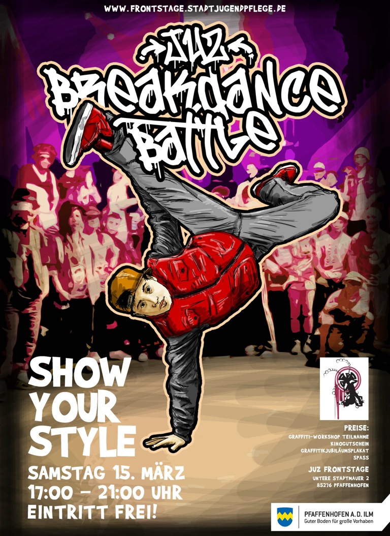 (ty) Die Stadtjugendpflege Pfaffenhofen veranstaltet am Samstag, 15. März, zum ersten Mal den Breakdance-Wettkampf „Show your Style“ im Jugendzentrum „Frontstage“ (Untere Stadtmauer 2). Der Battle richtet sich an Anfänger und leicht Fortgeschrittene. Daneben sind Breakdance-Interessierte ebenso wie alle Zaungäste eingeladen, die Aufführungen mit zu verfolgen.