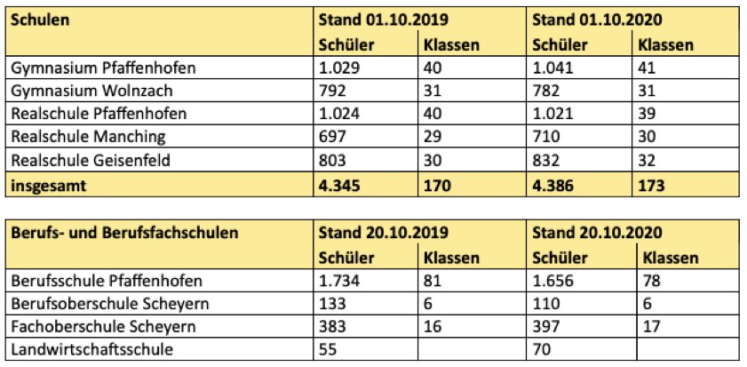 (ty) Die Zahl der Schülerinnen und Schüler an den weiterführenden Schulen im Kreis Pfaffenhofen ist im vergangenen Jahr insgesamt leicht angestiegen. Wie Landkreis-Verwaltung, die für den so genannten Sachaufwand zuständig ist, heute mitgeteilt hat, besuchten zum Stichtag 1. Oktober 2020 insgesamt 4386 junge Leute in 173 Klassen die Gymnasien und Realschulen im Landkreis. "Dies ist eine Zunahme um insgesamt 41 Schülerinnen und Schüler", erklärt Sebastian Daser, Leiter der Finanzverwaltung des Landkreises.