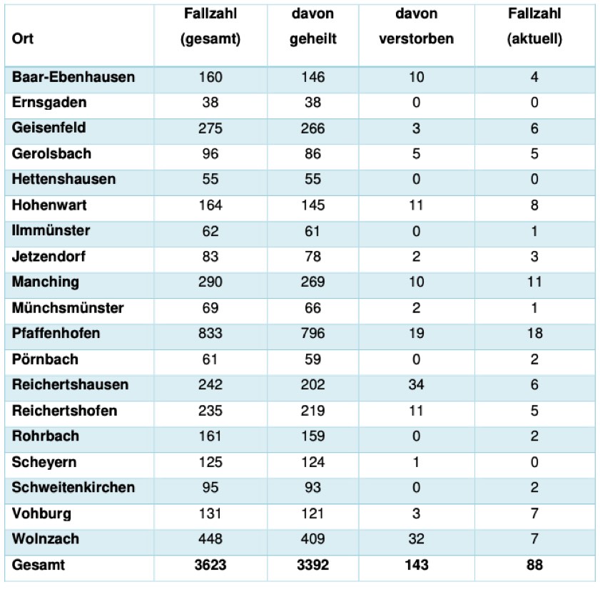 (ty) In Zusammenhang mit der Corona-Pandemie gibt es im Kreis Pfaffenhofen, wie berichtet, mittlerweile 143 Menschenleben zu beklagen. Das Landratsamt veröffentlicht eine tägliche Übersicht (siehe unten), in welchen Gemeinden die mit dem Virus infizierten Menschen, die gestorben sind, gelebt haben beziehungsweise wie viele bestätigte Infektionsfälle und genesene Patienten es in welcher Kommune gibt. Die Zahl der Landkreis-Bürger, die positiv auf den neuartigen Erreger getestet worden sind, hat sich seit der Meldung von gestern um zwölf erhöht und beträgt nunmehr 3623.