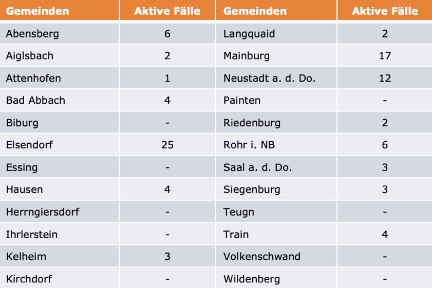 (ty) Im Kreis Kelheim gibt es in Zusammenhang mit der Corona-Pandemie ein weiteres Menschenleben zu beklagen. Wie das Landratsamt heute gegenüber unserer Redaktion erklärte, ist ein mit dem Erreger infizierter Mann (Jahrgang 1945) gestorben, der unter Vorerkrankungen litt. Damit erhöht sich die Zahl der infizierten Landkreis-Bürger, die gestorben sind, auf nunmehr 75. Unter Verweis auf Daten der Behörde teilte das Landratsamt heute mit, dass – Stand gestern, 16 Uhr – die Zahl der im Kreis Kelheim positiv auf den neuartigen Erreger getesteten Menschen bei insgesamt 3114 liegt – das sind zwölf mehr als gestern gemeldet. 2945 hiesige Corona-Patienten (gestern: 2929) gelten mittlerweile als genesen und sind aus der Quarantäne entlassen. Derzeit gibt es 94 aktive Corona-Fälle im Landkreis (gestern: 99). Zahlen aus den einzelnen Gemeinden zeigt die Tabelle unten.