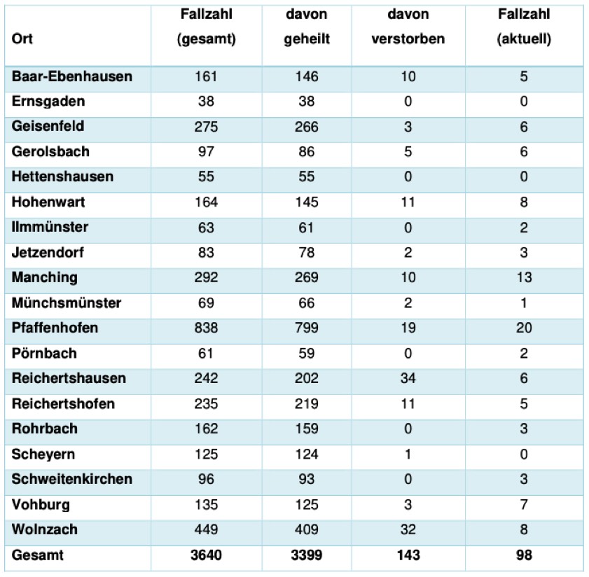 (ty) In Zusammenhang mit der Corona-Pandemie gibt es im Kreis Pfaffenhofen, wie berichtet, mittlerweile 143 Menschenleben zu beklagen. Das Landratsamt veröffentlicht eine tägliche Übersicht (siehe unten), in welchen Gemeinden die mit dem Virus infizierten Menschen, die gestorben sind, gelebt haben beziehungsweise wie viele bestätigte Infektionsfälle und genesene Patienten es in welcher Kommune gibt. Die Zahl der Landkreis-Bürger, die positiv auf den neuartigen Erreger getestet worden sind, hat sich seit der Meldung von gestern um 17 erhöht und beträgt nunmehr 3640.